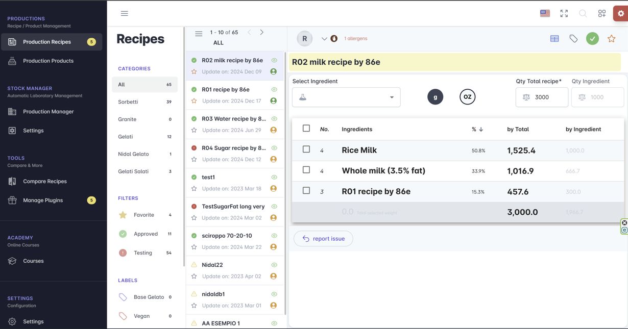 Usa questo plugin per gestire la ricetta durante la sua produzione. Riscalatura facile e veloce, si può fare per totale di ricetta oppure per quantità di ingrediente.